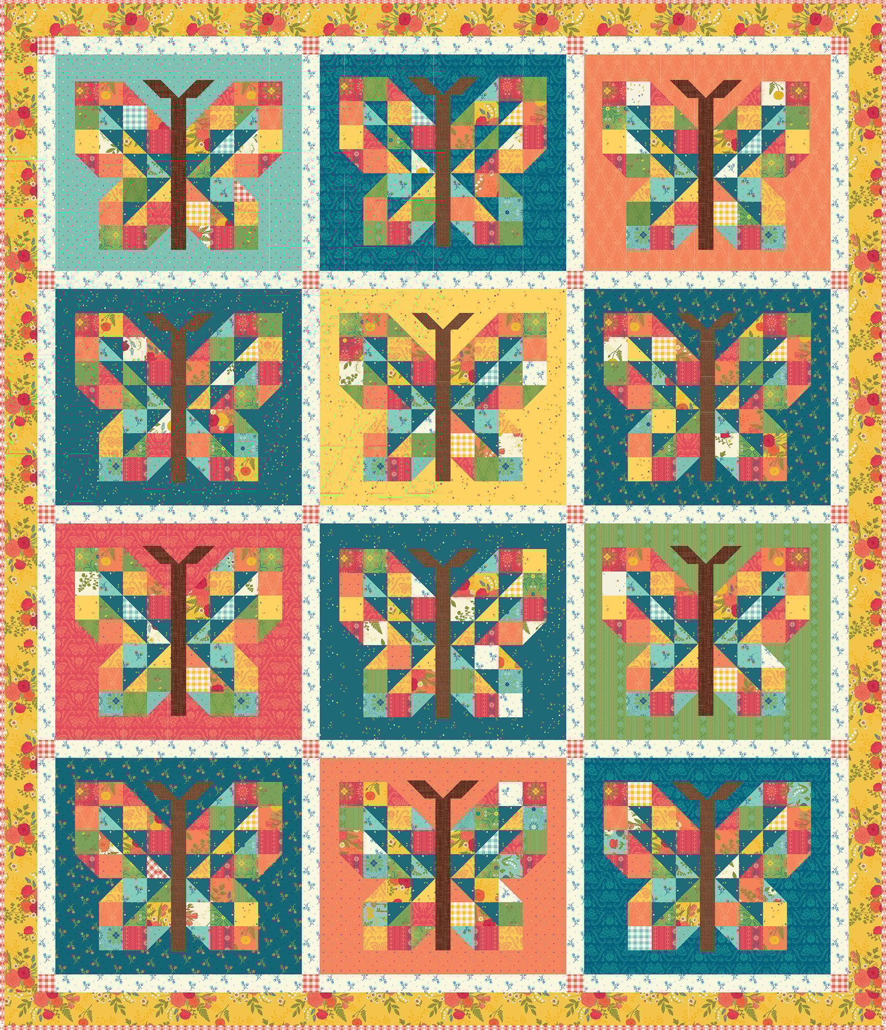 This pattern features the First Blooms collection by Heather Peterson for Riley Blake Designs. The pattern is 10" square friendly and features multiple size options and two different settings. Kits for this design can be found under the kits tab.