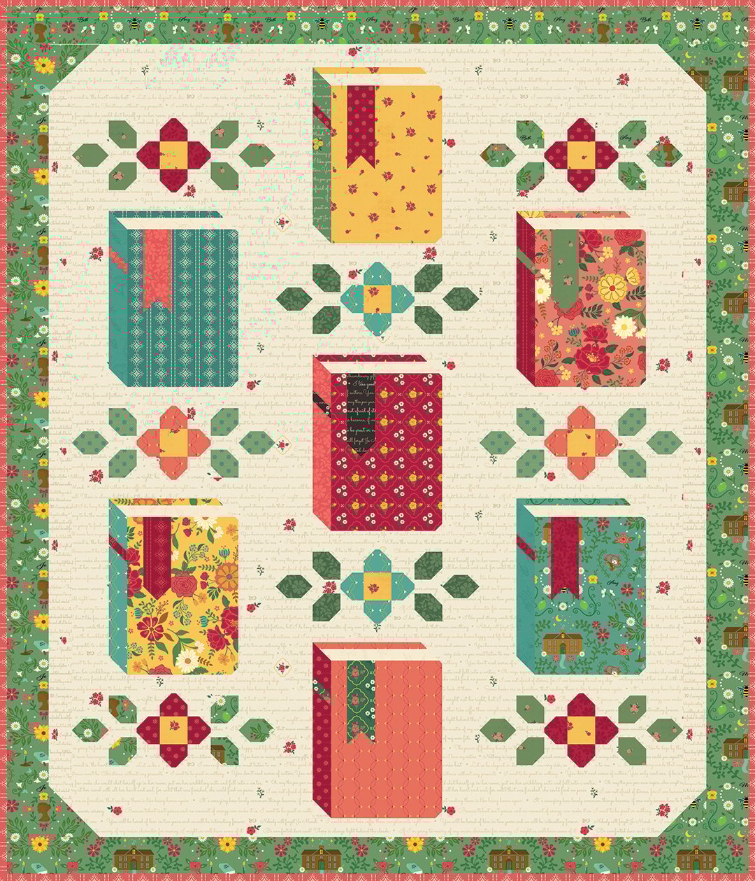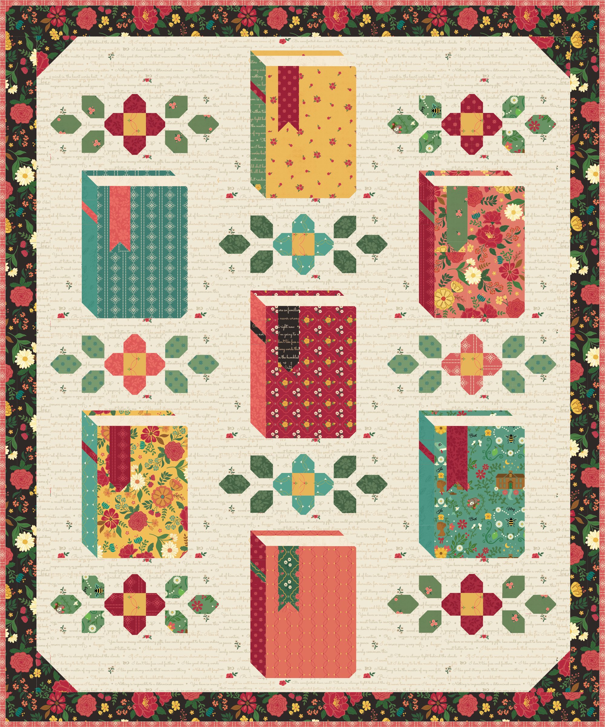 This pattern is for all the book lovers that are also quilters! Traditionally pieced with templates. Features the Orchard House fabric collection by Heather Peterson for Riley Blake Designs, including the text print with all of my favorite sayings from the Little Women book and movies. The back cover quilt features the first Blooms collection by Heather Peterson for Riley Blake Designs. The pattern is traditionally pieced using folded corners, so requires no templates or applique.