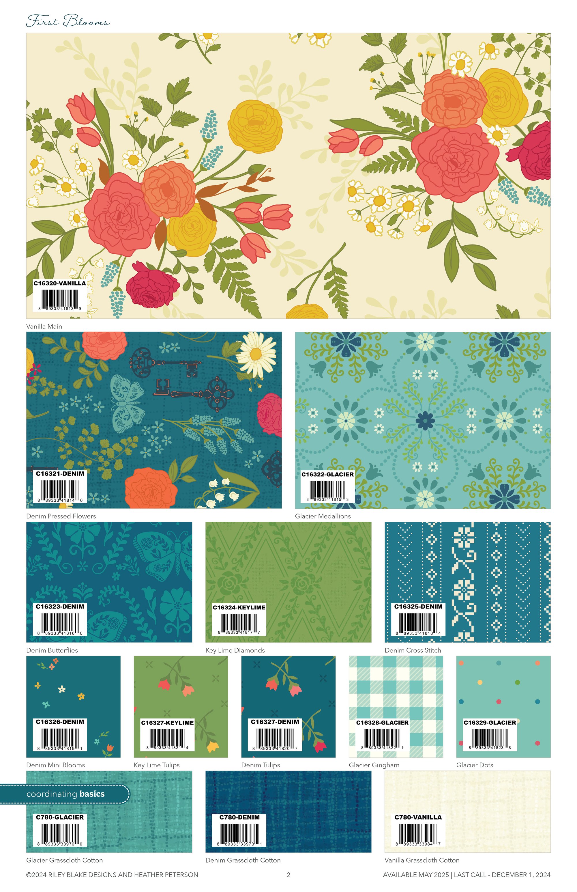 The kit features the First Blooms fabric line by Heather Peterson for Riley Blake Designs. The kit includes fabric for the top and binding.