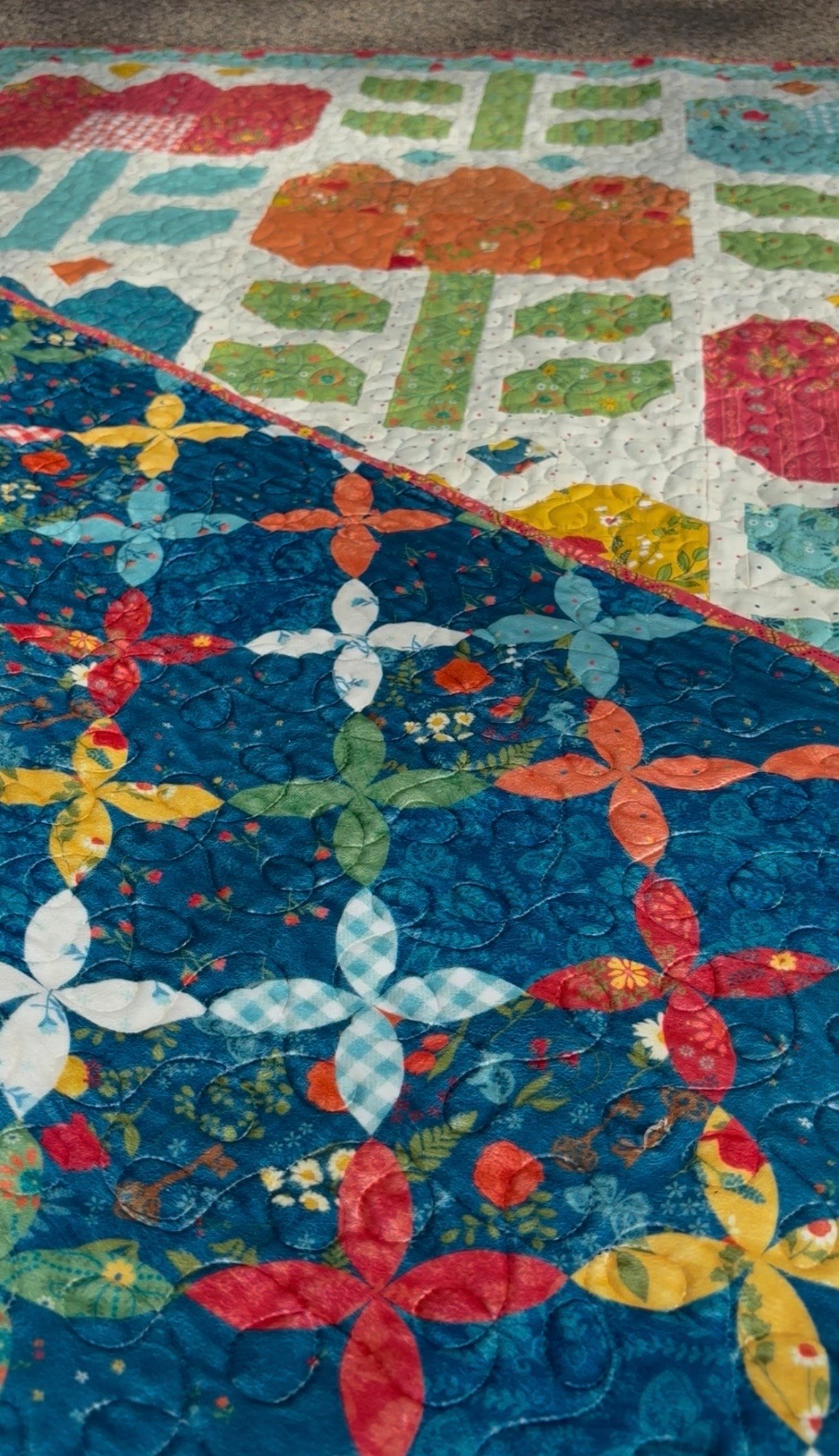 The 10th and 11th photos show the backing that we chose for this quilt - It's the Double Lush Velvet by Riley Blake Designs. It is similar to minky in feel and is super soft and lush! This fabric is $13.99 per half yard and is 58-60" wide. You will need 2 yards to back this size quilt. (Please note: It is a little bit of a tight squeeze to fit this backing on this quilt at 56" wide, so please note that there is not a lot of extra width to play with. Some machine quilters may not accept your project without having a certain number of extra inches on both sides of the quilt, so you may want to check with your quilter before purchasing this backing. I quilted this myself and didn't have any trouble making it work, but I wanted to give that disclaimer in case!)
